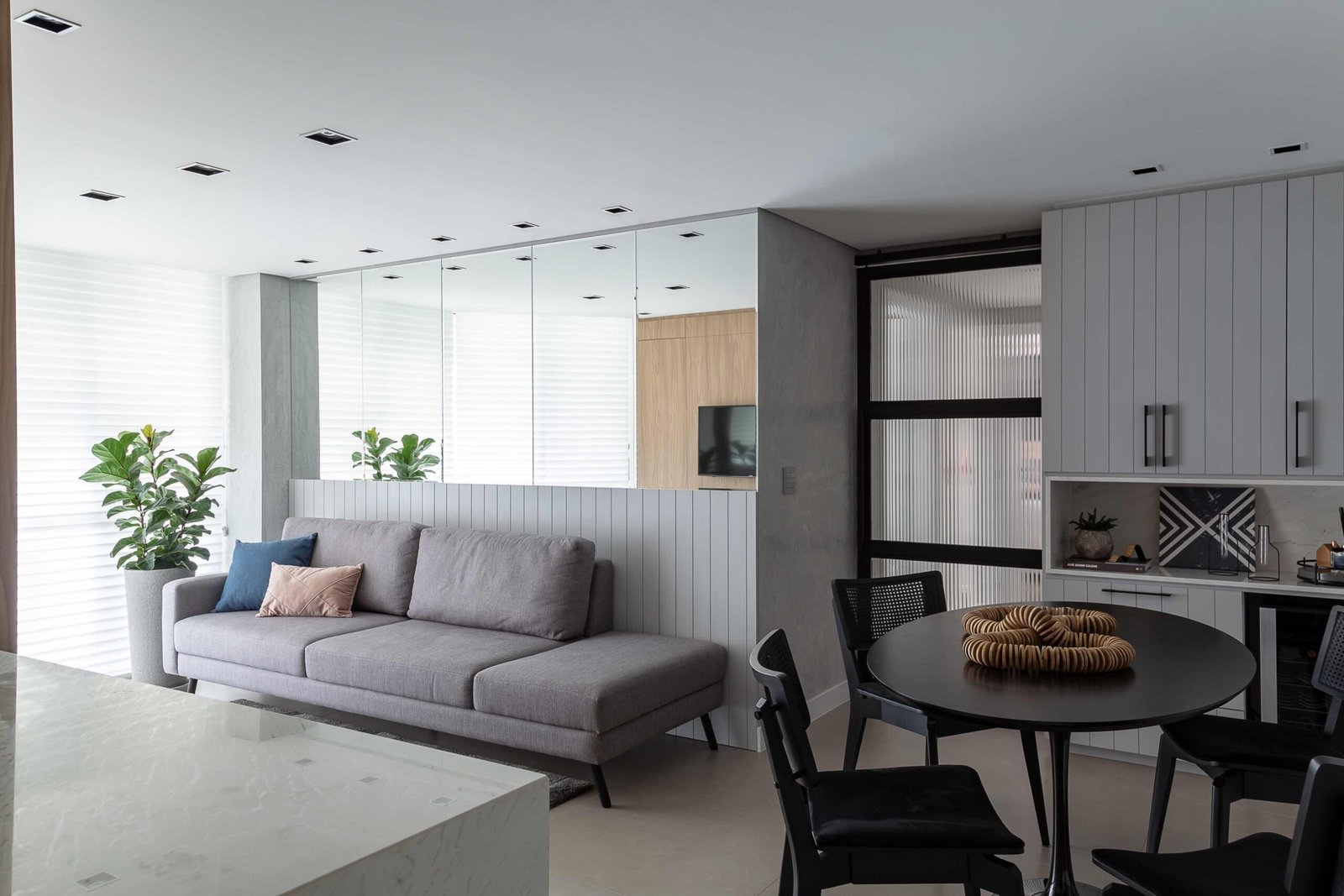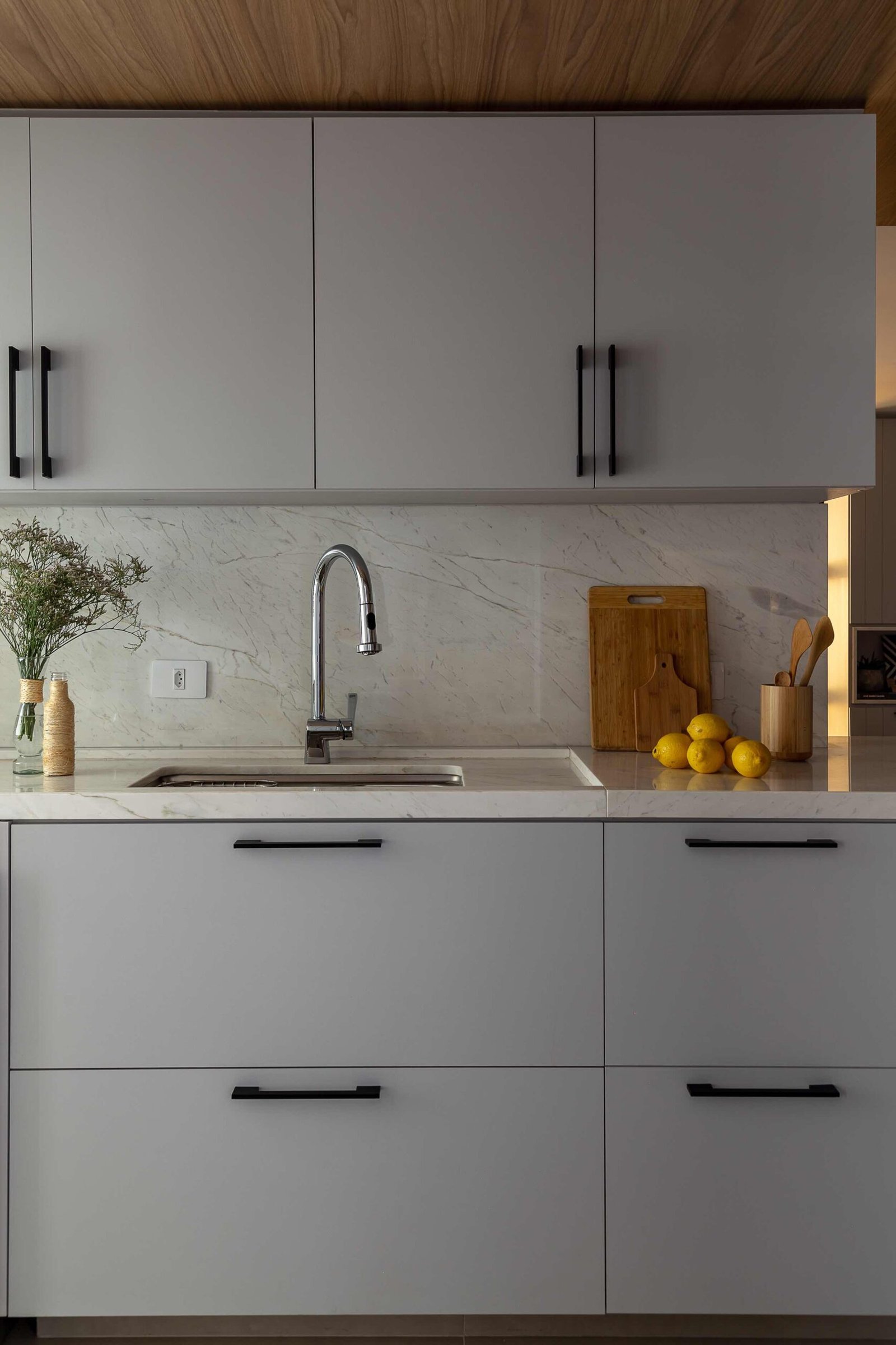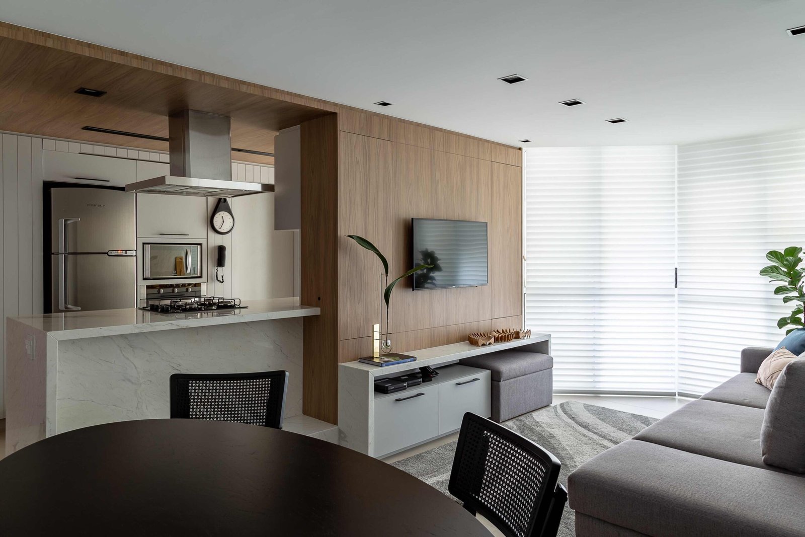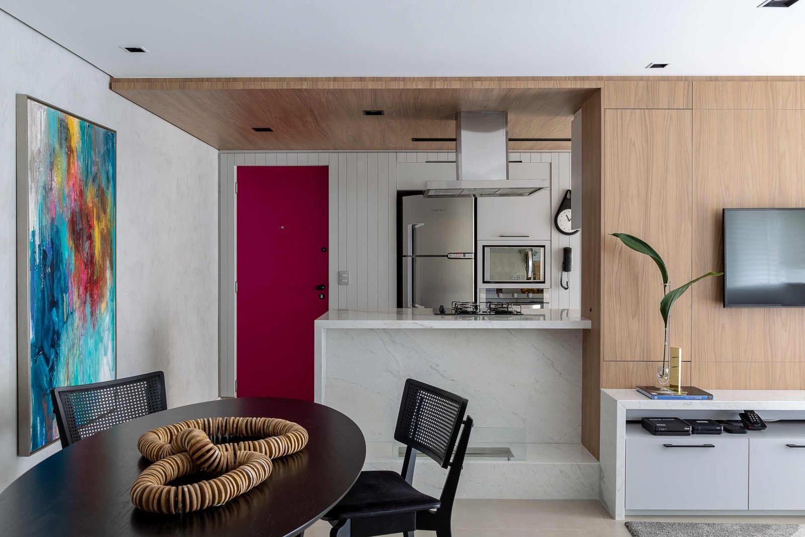 Este projeto foi uma reforma completa para um jovem casal estava voltando a moral no Brasil depois de uma temporada na Austrália. Eles pediram que transformássemos a cozinha e sala em um ambiente integrado (o que não era originalmente), e que os ambientes traduzissem a sua personalidade, com toques pontuais de cor.