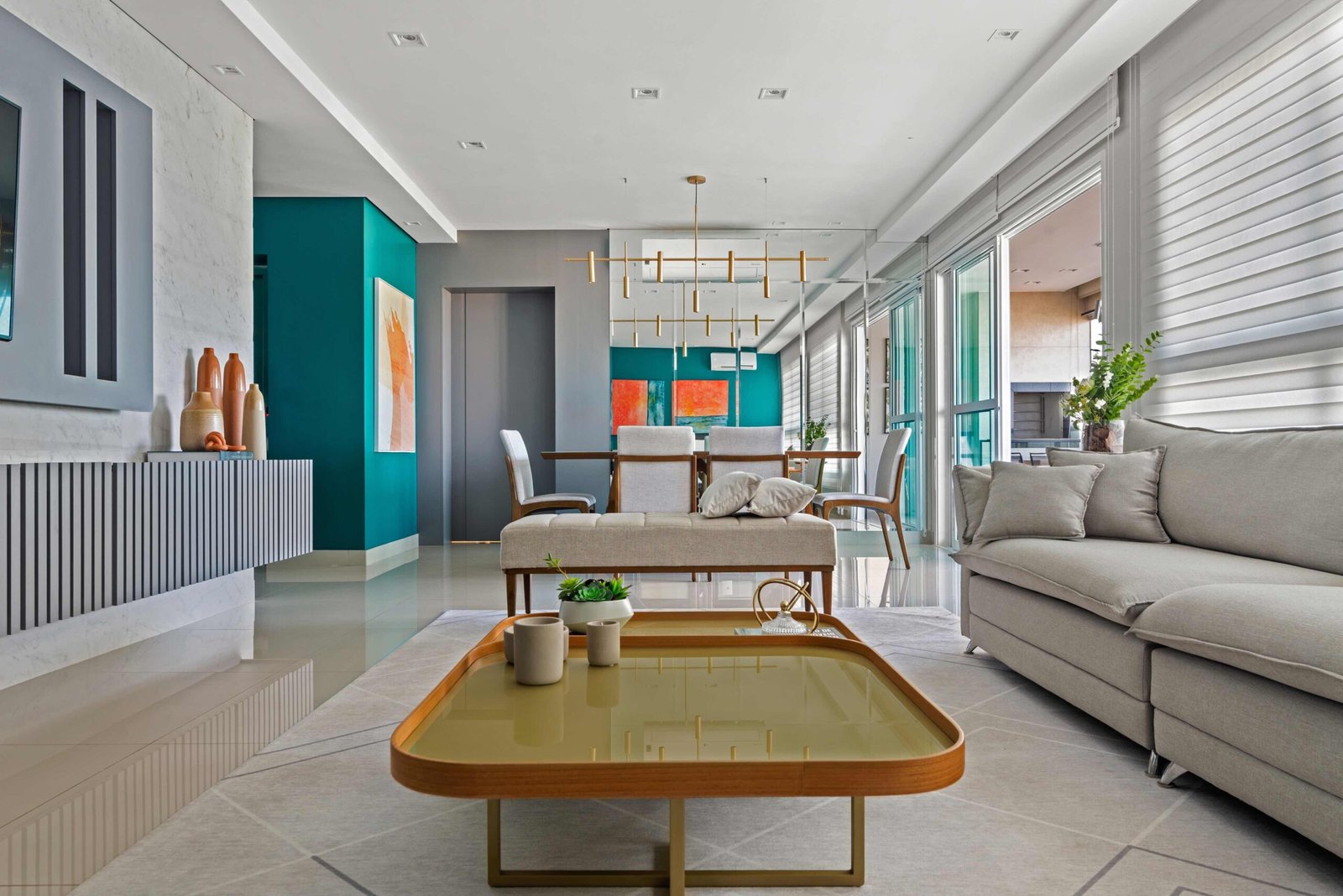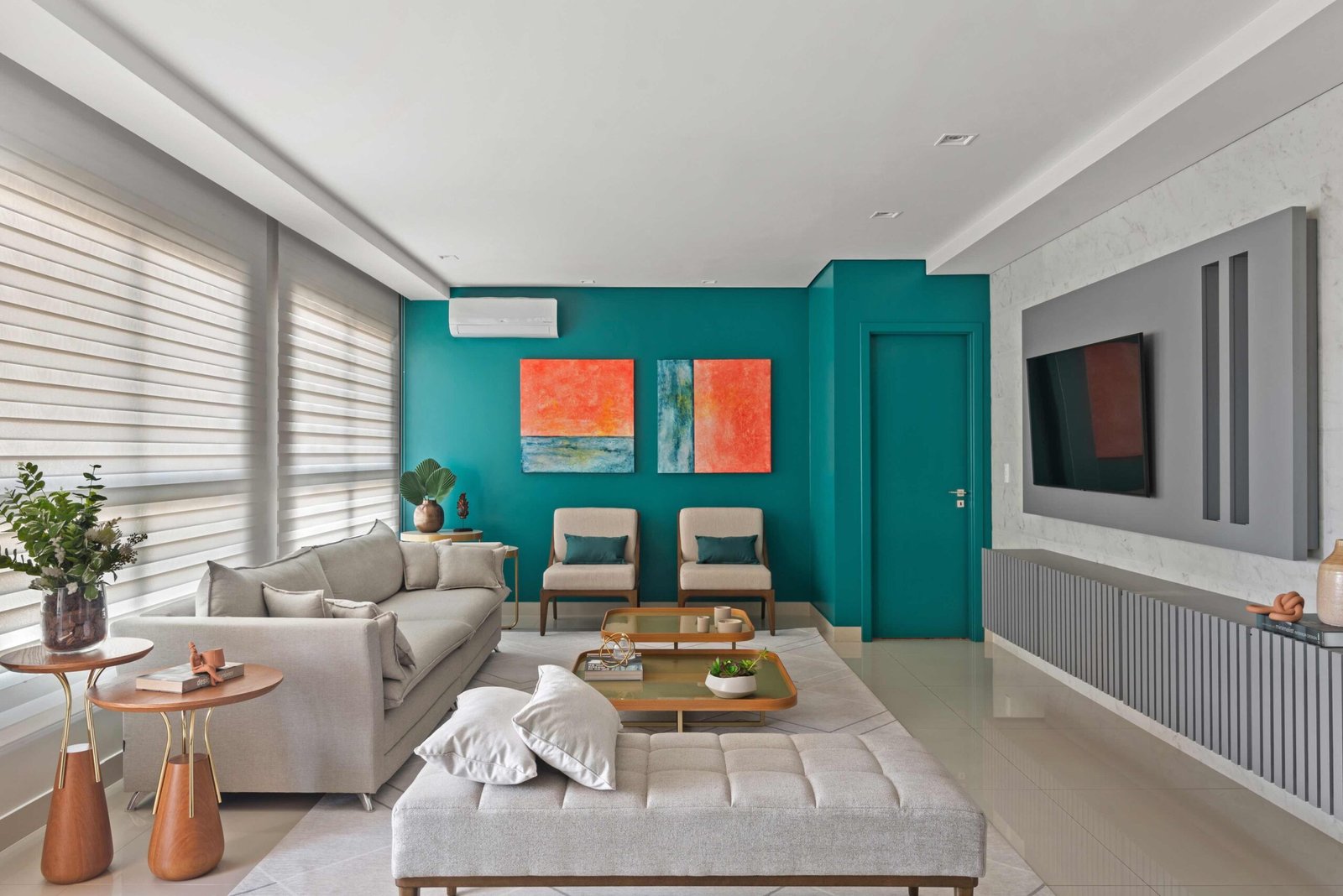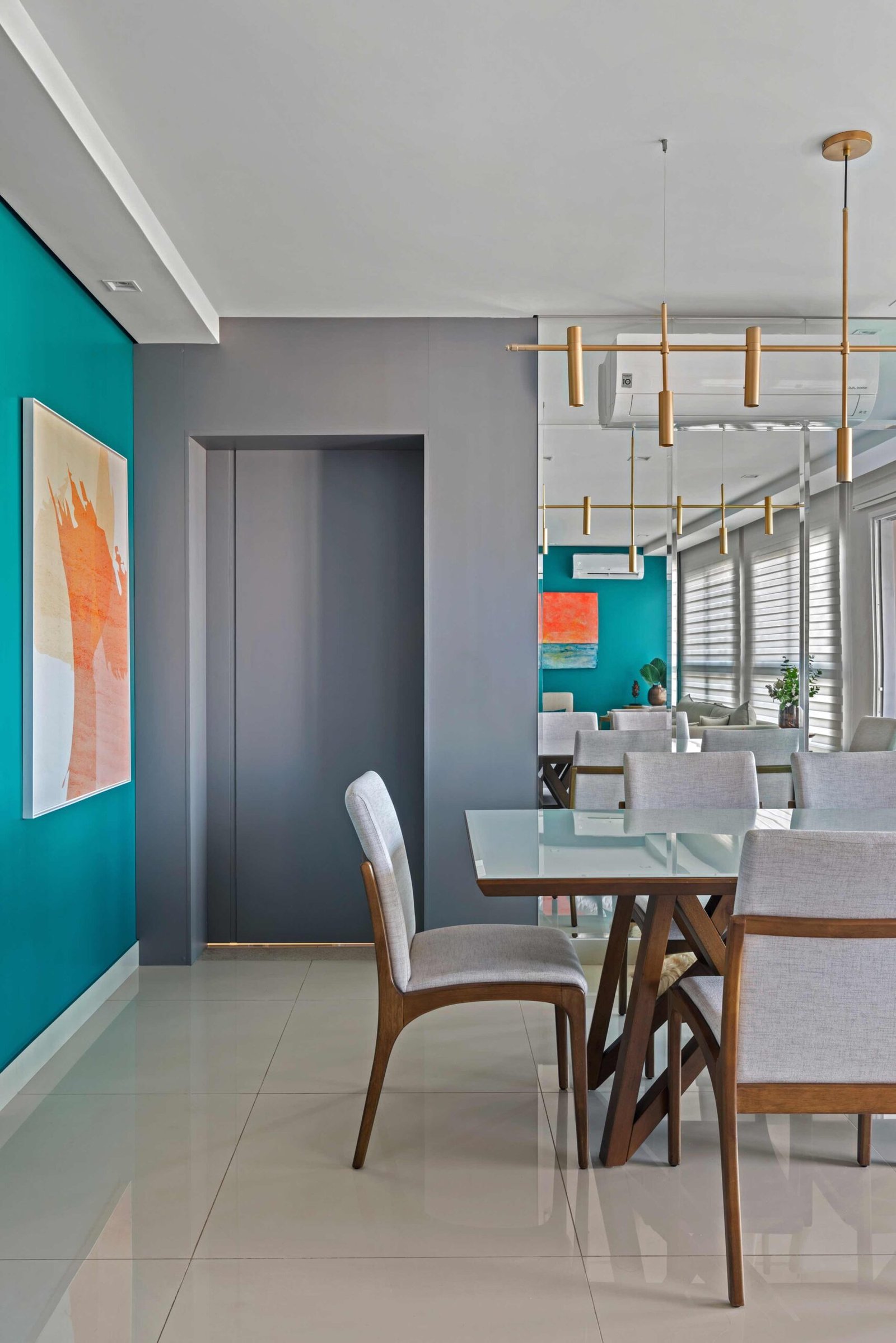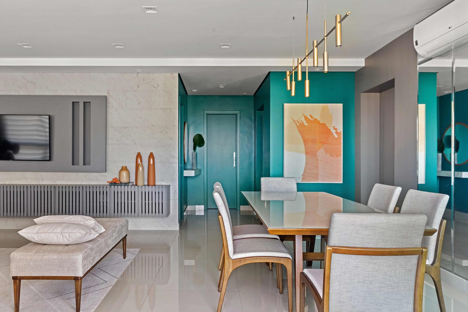 Este projeto foi desenvolvido para um apartamento em Cuiabá-MT. Sendo uma das cidades mais quentes do Brasil, a premissa do projeto foi que ele transmitisse frescor e personalidade. Usando da cor no lugar de painéis de madeira (que passam a sensação de mais calor) criamos a atmosfera desejada pelos clientes.