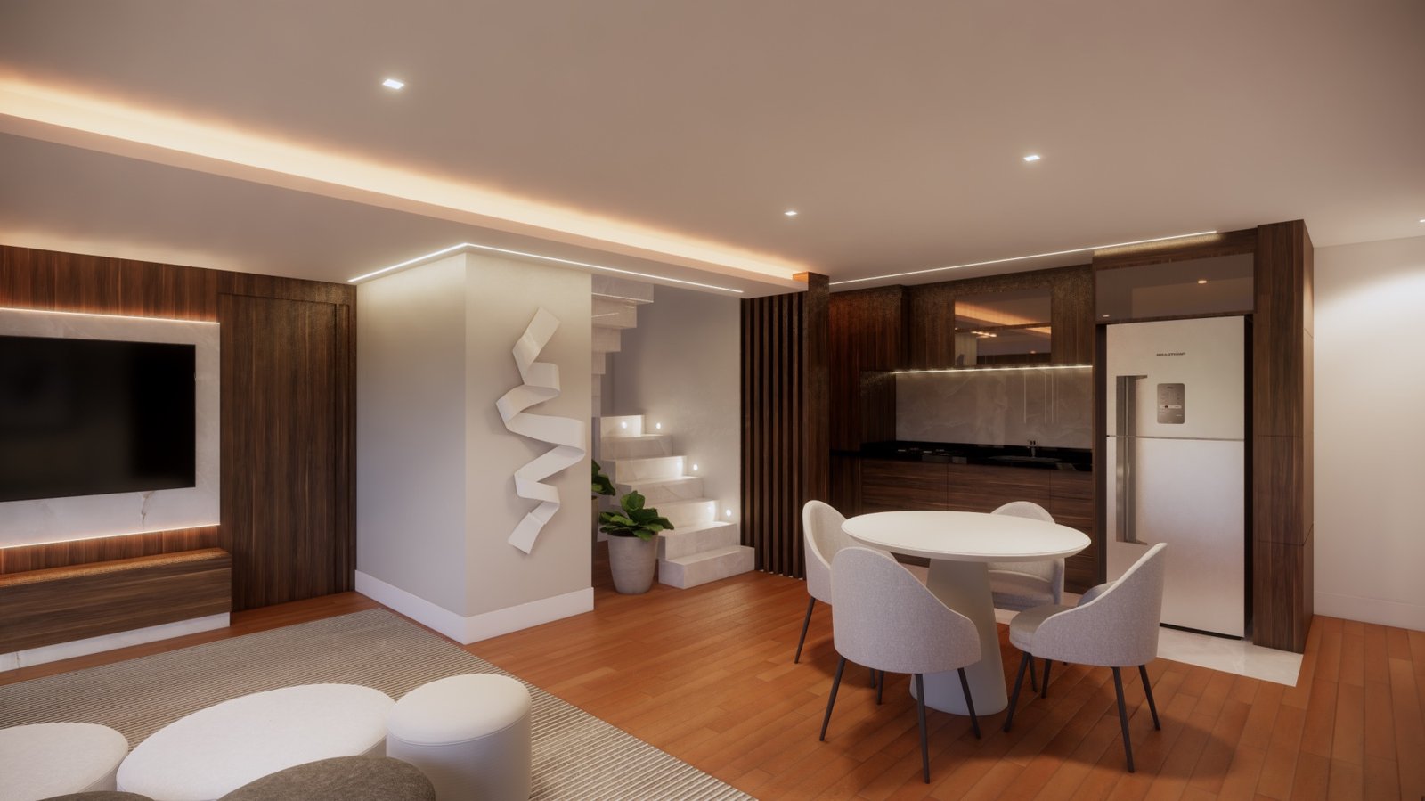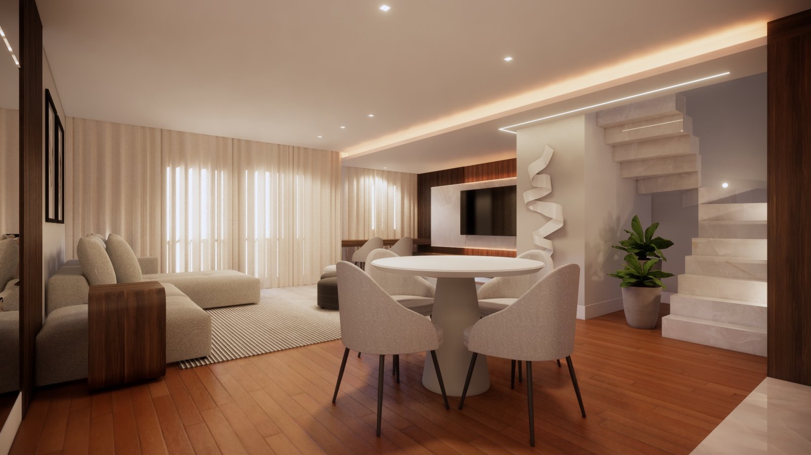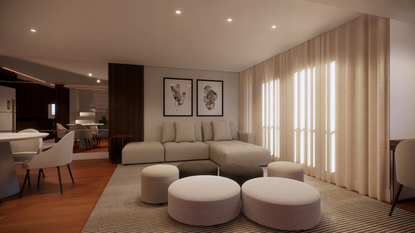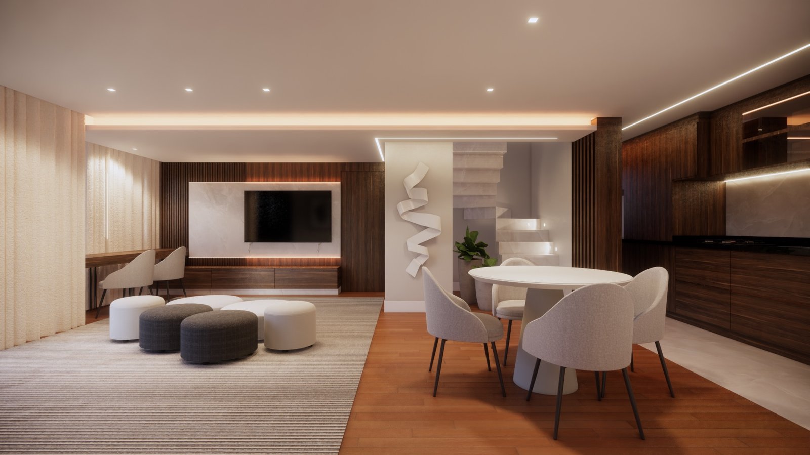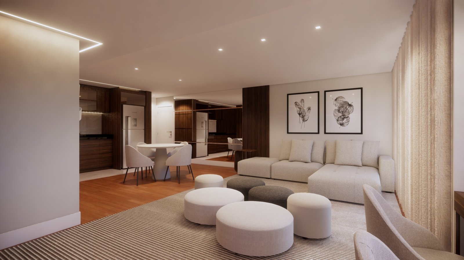 A pedida do cliente para esta cobertura era: precisamos de espaço para ficarmos todos juntos assistindo futebol. Então abrimos um dos quartos e aumentamos o espaço da sala de estar para comportar mais gente. Para a decoração usamos como ponto de partida a tonalidade de madeira que já tinha na casa que, como era mais escura, usamos tons mais claros nos outros itens para contrabalancear.