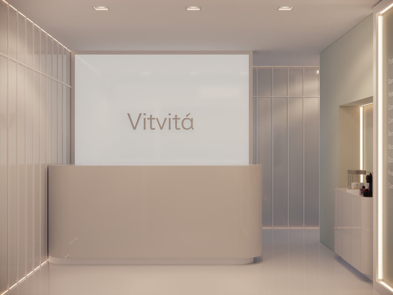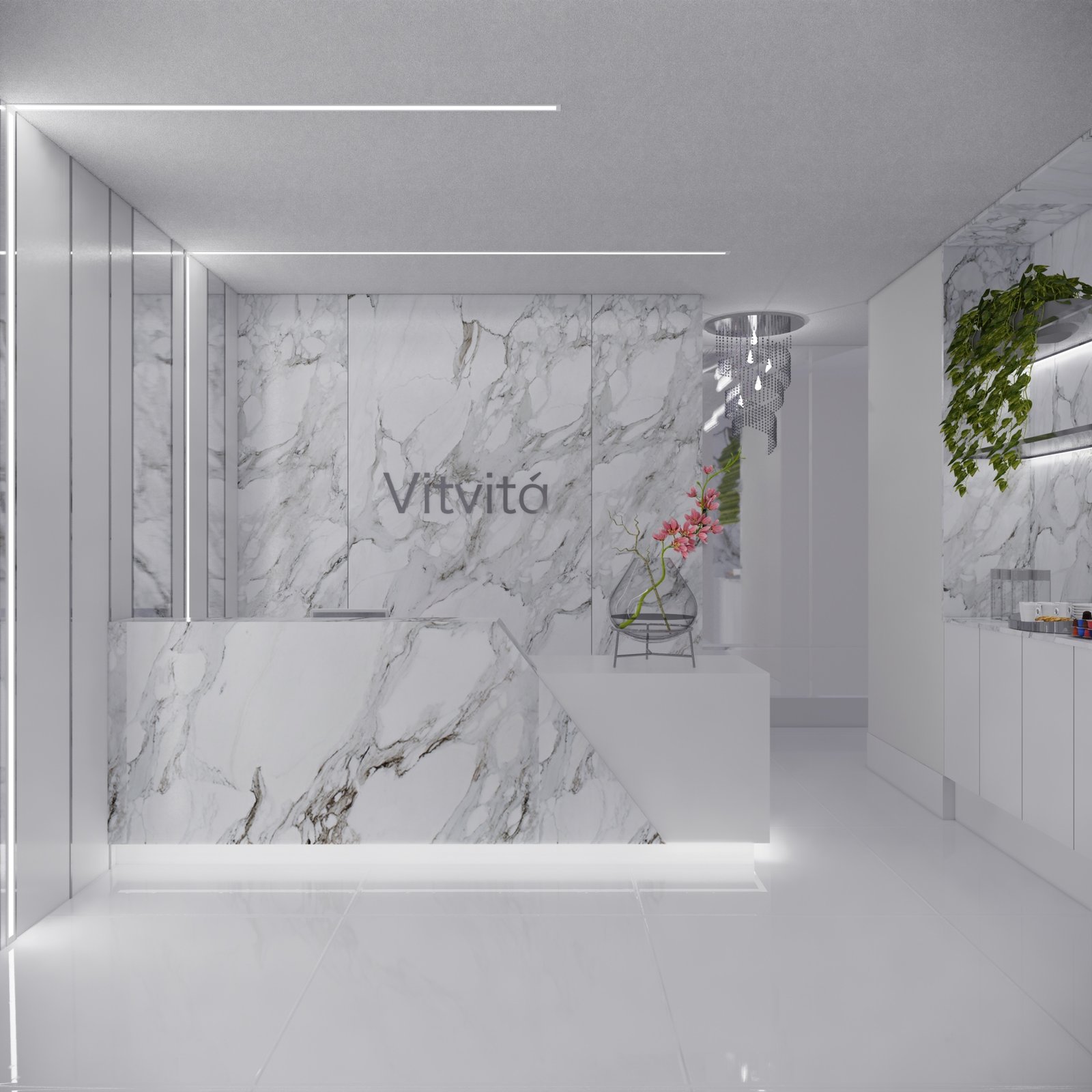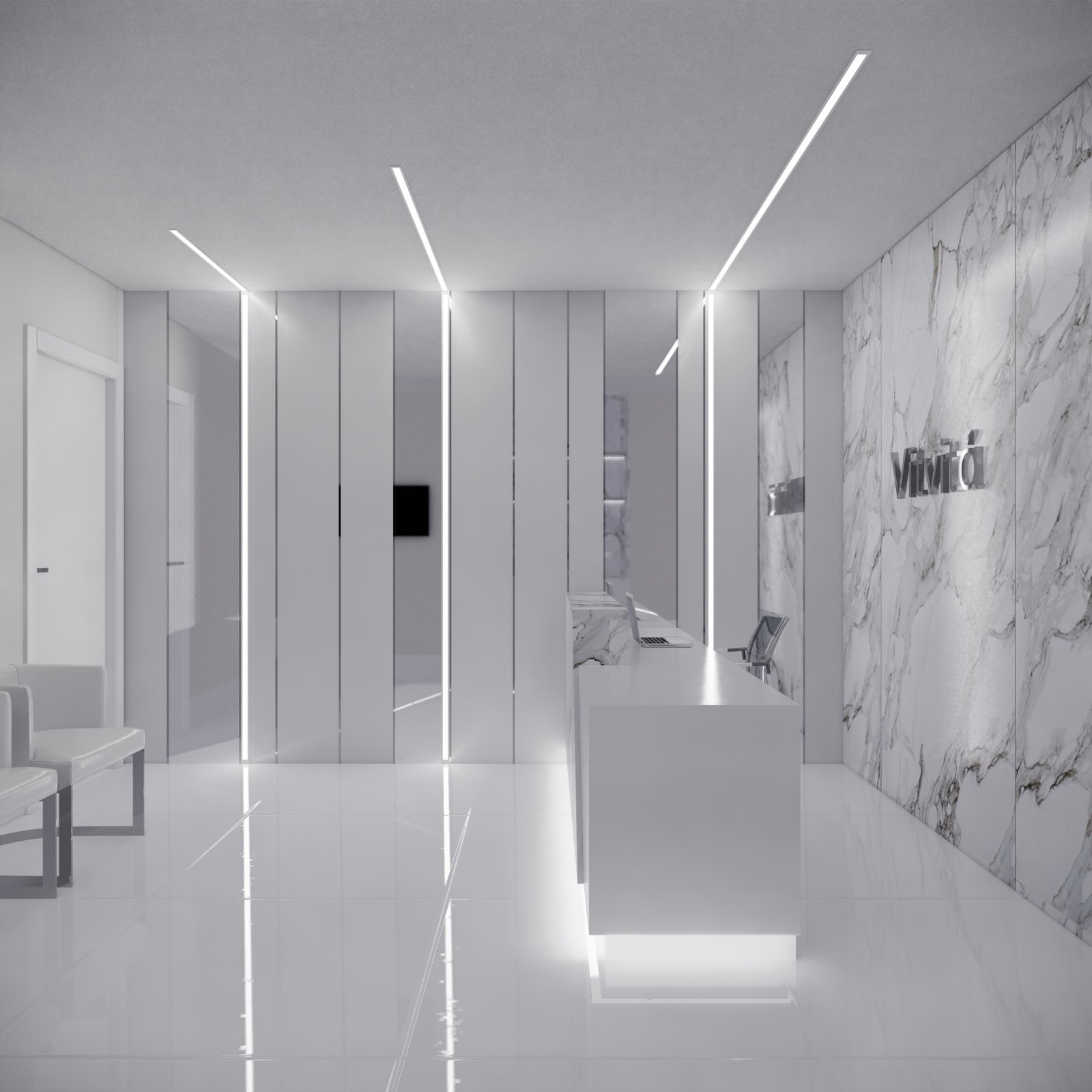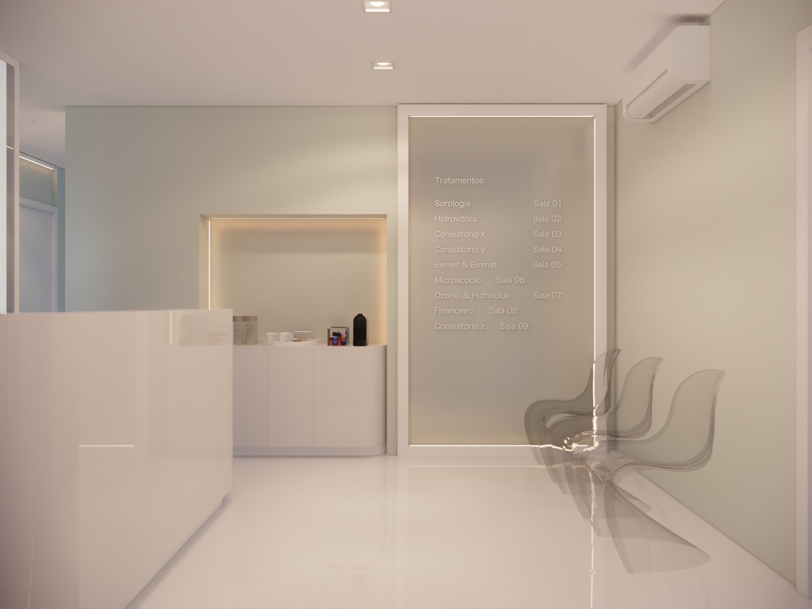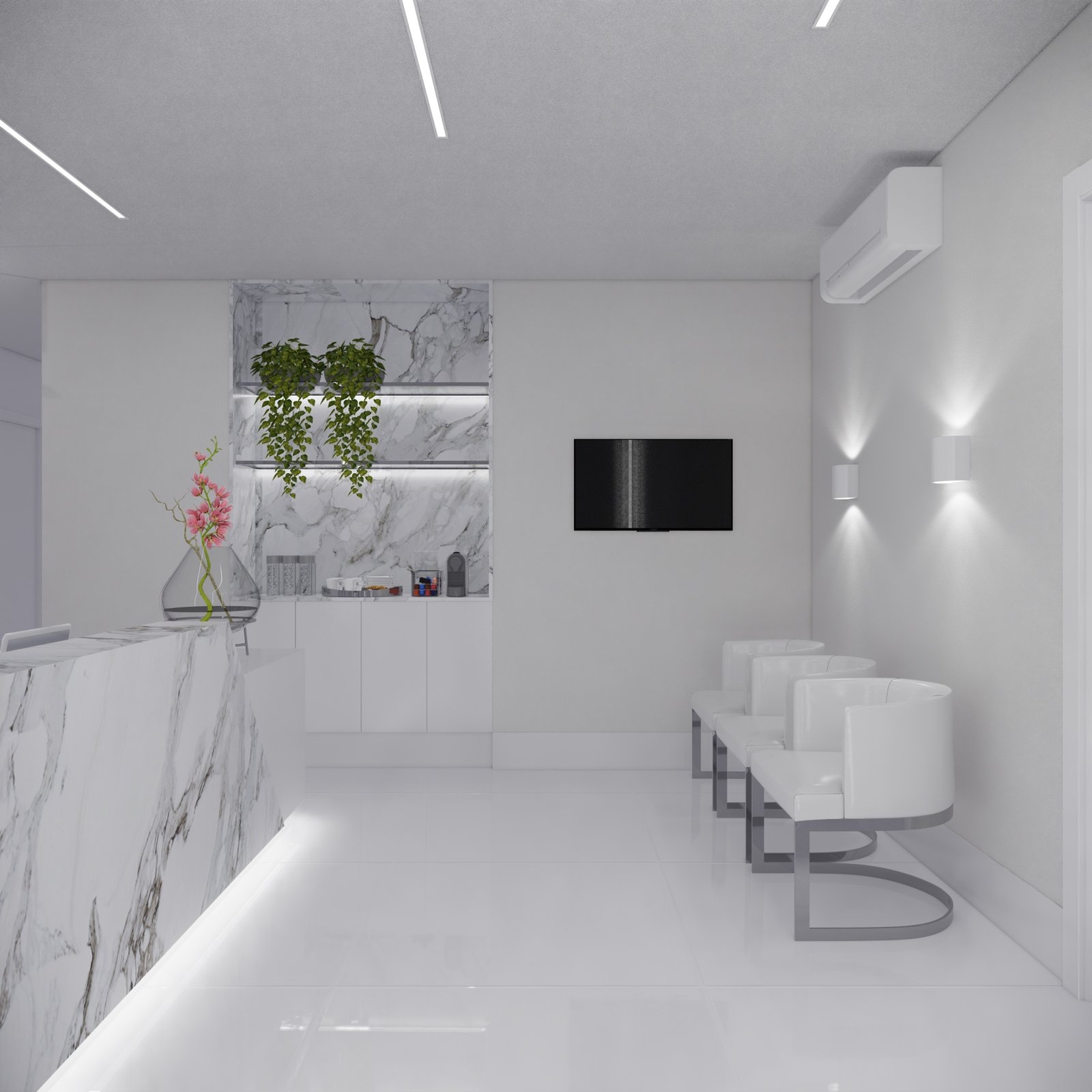 Este projeto foi elaborado para uma clínica de médica onde unimos 3 salas comerciais. Fizemos um estudo de recepção com a opção mais futurista e outra opção mais clássica. A opção mais clássica que foi executada.