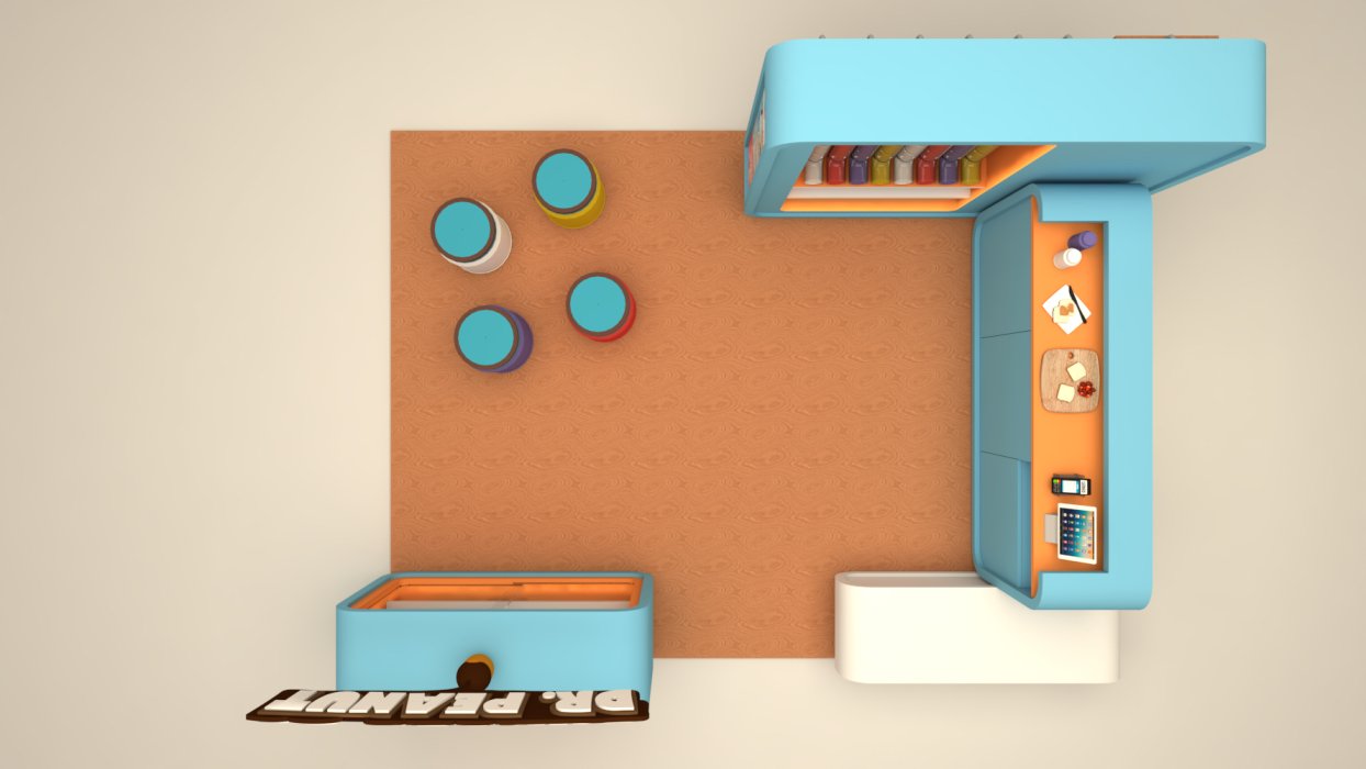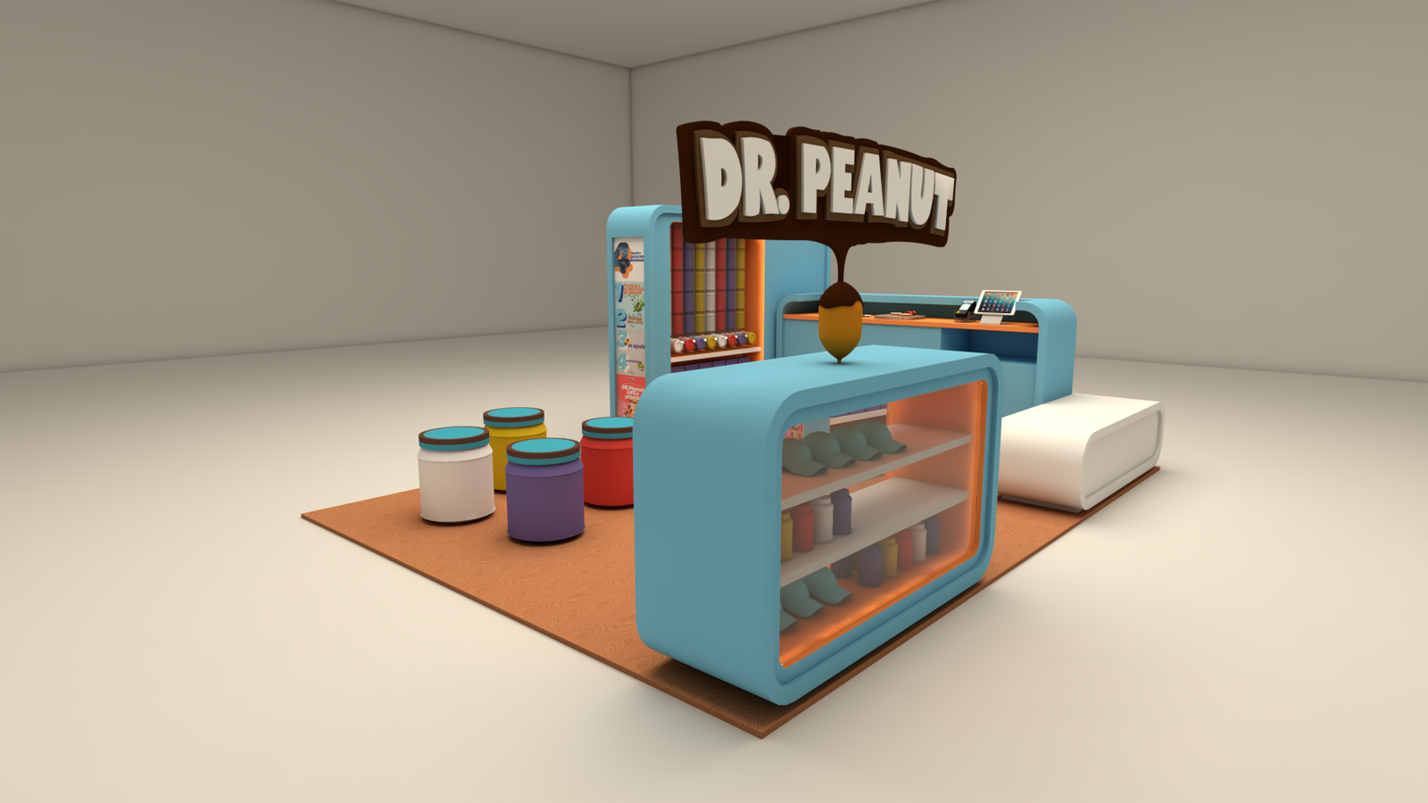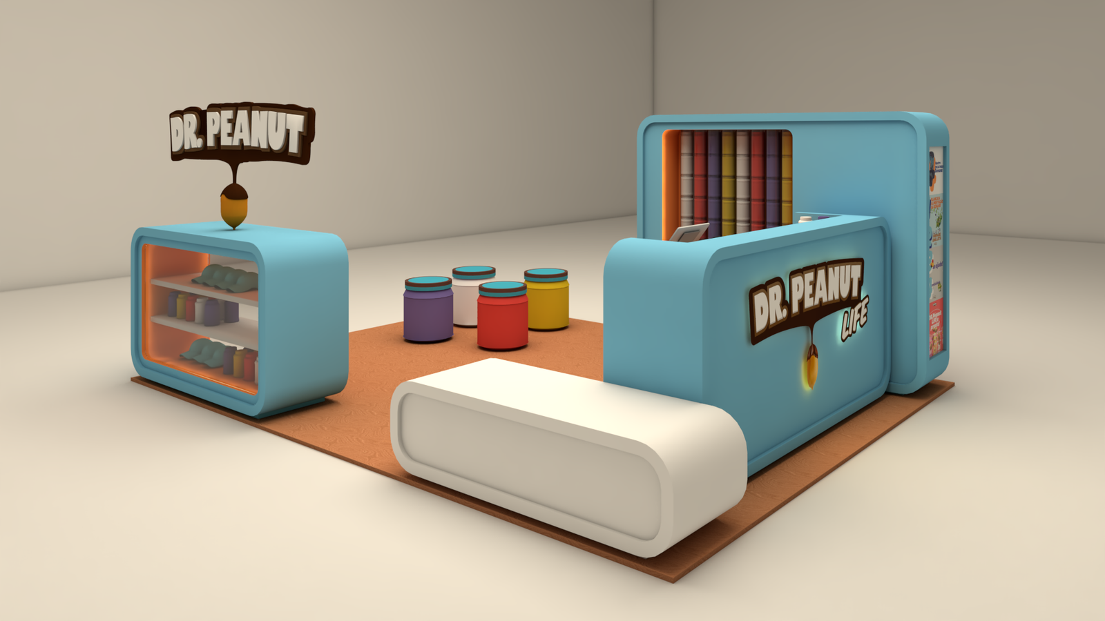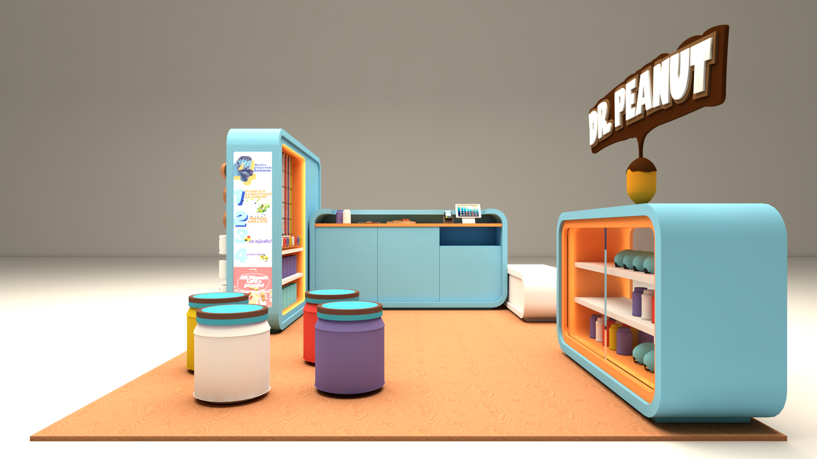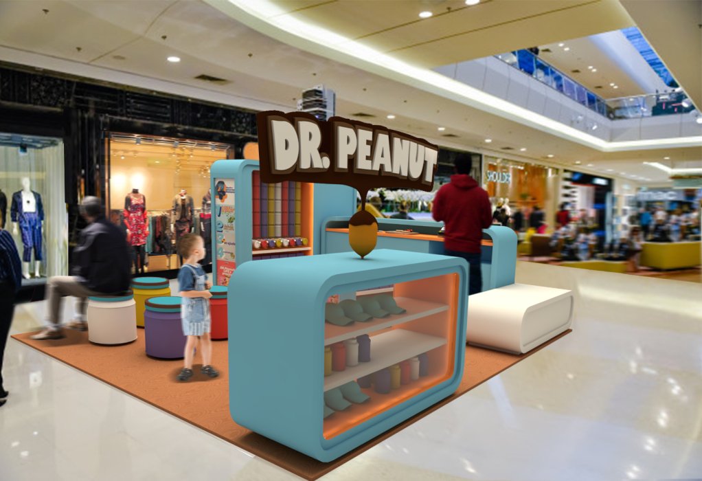 Quiosque Dr. Peanut A demanda do cliente para este projeto era criar uma linha de quiosques para promover o produto deles para o público infantil. Usando as cores da marca em volumes soltos e modulares chegamos no quiosque perfeito.
