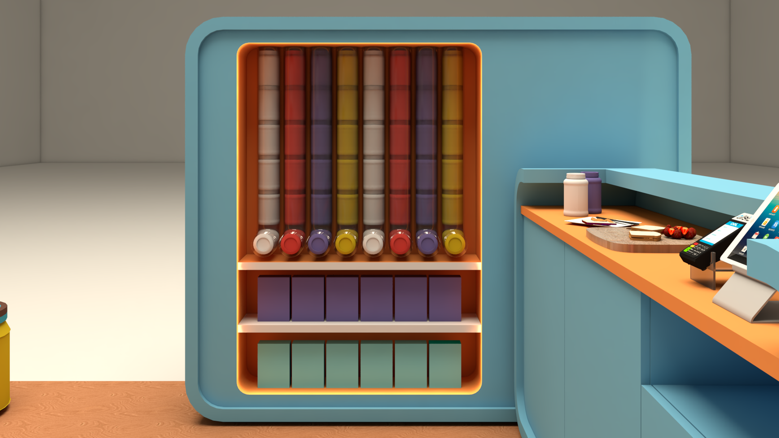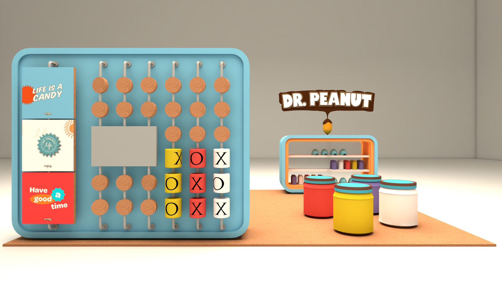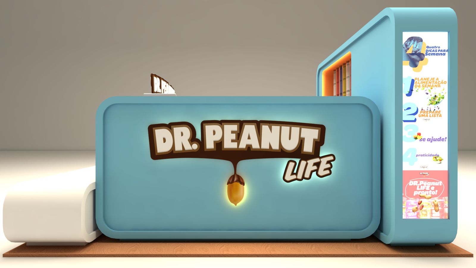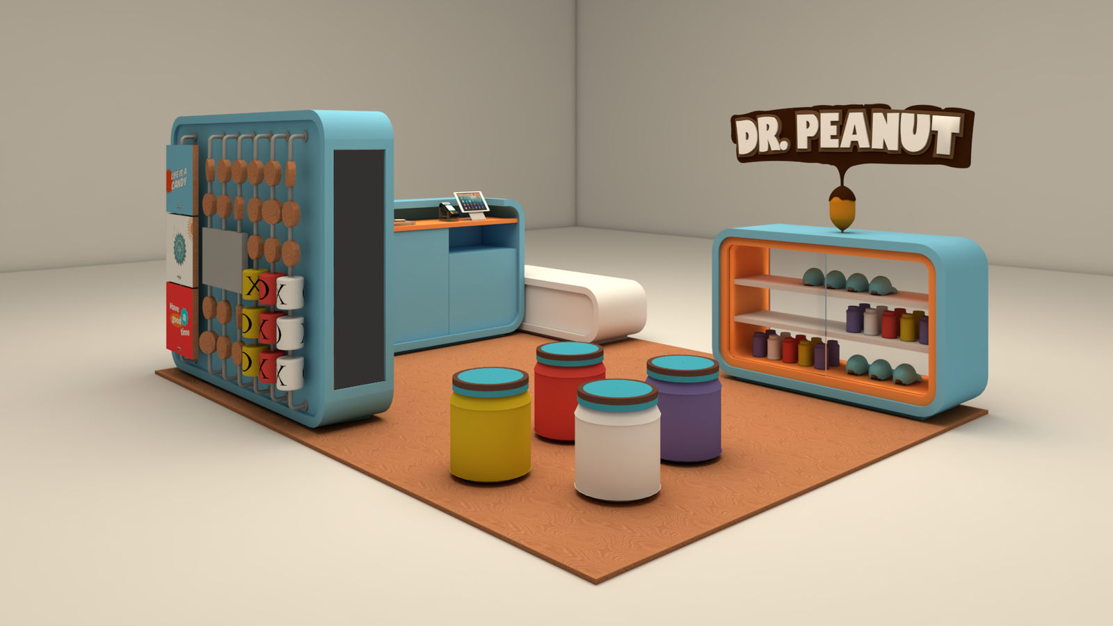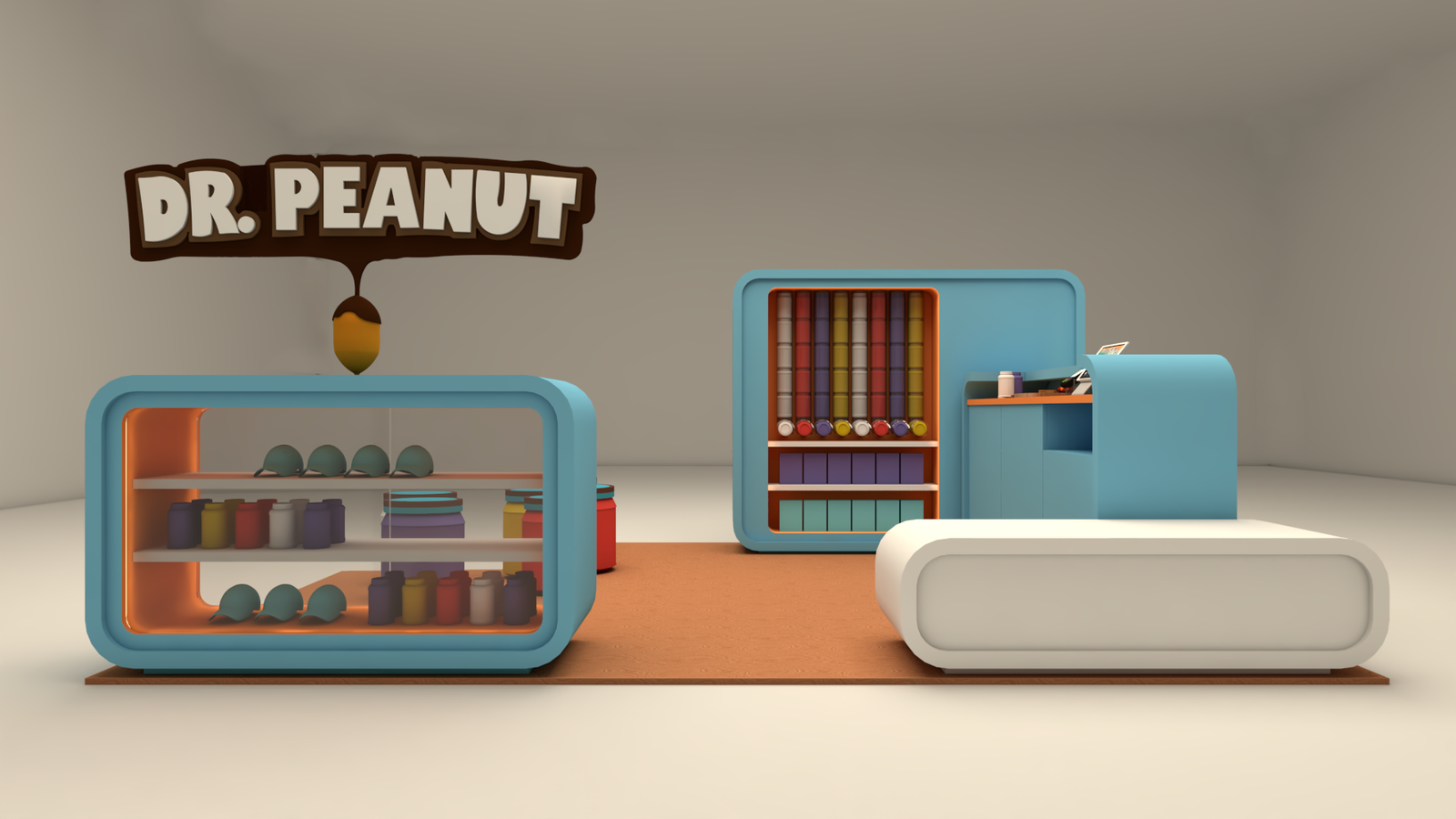 Quiosque Dr. Peanut A demanda do cliente para este projeto era criar uma linha de quiosques para promover o produto deles para o público infantil. Usando as cores da marca em volumes soltos e modulares chegamos no quiosque perfeito.
